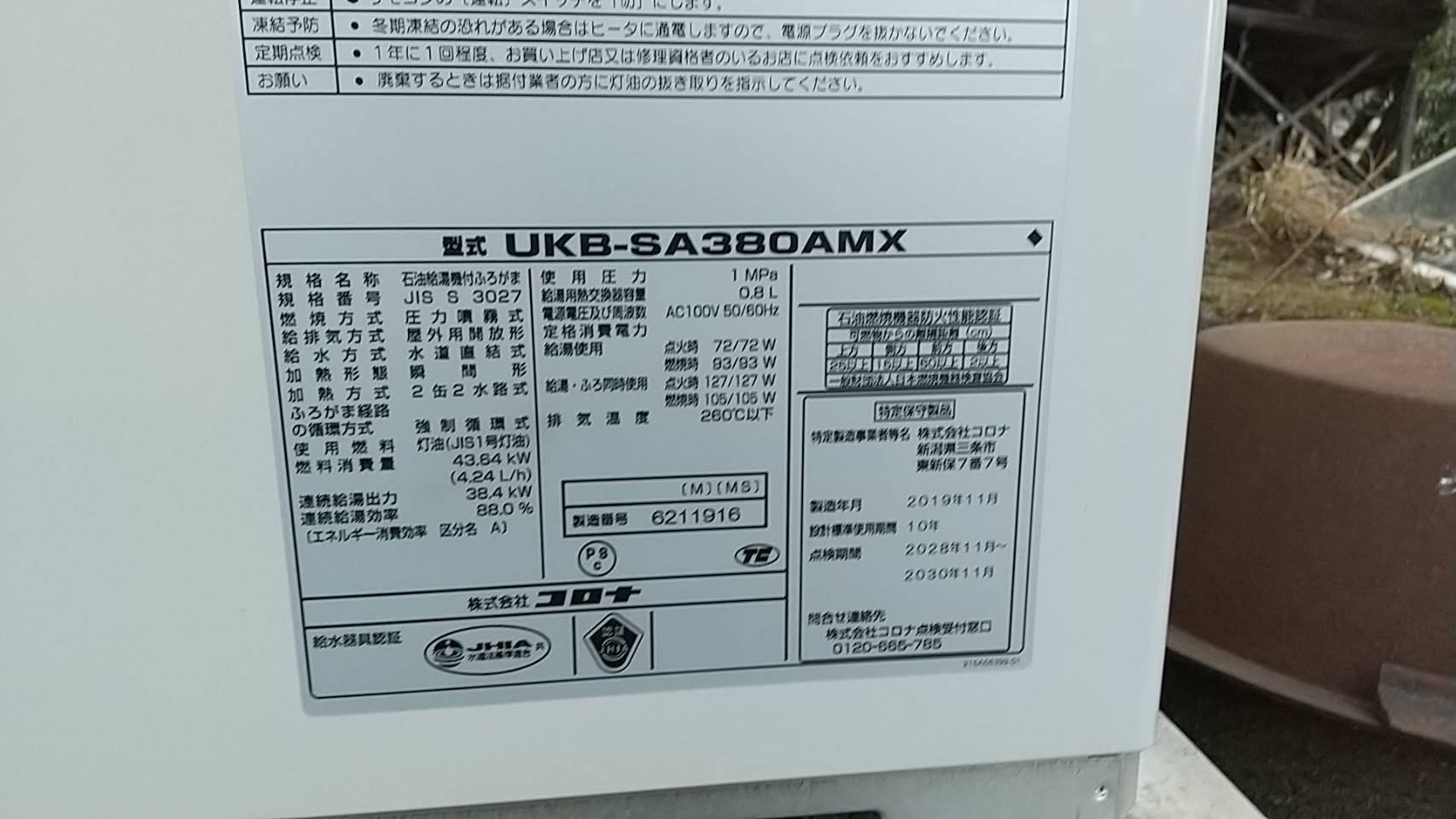 観音寺市 コロナ石油給湯器交換工事UKB-SA380AMX|香川県で給湯器交換・取り付けなら|激安給湯器交換、香川給湯器.com